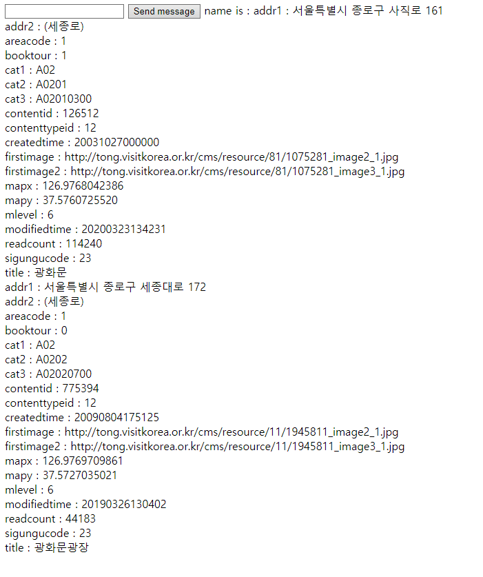 {'item0': '{"addr1": "서울특별시 종로구 사직로 161", "addr2": "(세종로)", "areacode": 1, "booktour": 1, "cat1": "A02", "cat2": "A0201", "cat3": "A02010300", "contentid": 126512, "contenttypeid": 12, "createdtime": 20031027000000, "firstimage": "http://tong.visitkorea.or.kr/cms/resource/81/1075281_image2_1.jpg", "firstimage2": "http://tong.visitkorea.or.kr/cms/resource/81/1075281_image3_1.jpg", "mapx": 126.9768042386, "mapy": "37.5760725520", "mlevel": 6, "modifiedtime": 20200323134231, "readcount": 114240, "sigungucode": 23, "title": "광화문"}', 'item1': '{"addr1": "서울특별시 종로구 세종대로 172", "addr2": "(세종로)", "areacode": 1, "booktour": 0, "cat1": "A02", "cat2": "A0202", "cat3": "A02020700", "contentid": 775394, "contenttypeid": 12, "createdtime": 20090804175125, "firstimage": "http://tong.visitkorea.or.kr/cms/resource/11/1945811_image2_1.jpg", "firstimage2": "http://tong.visitkorea.or.kr/cms/resource/11/1945811_image3_1.jpg", "mapx": 126.9769709861, "mapy": 37.5727035021, "mlevel": 6, "modifiedtime": 20190326130402, "readcount": 44183, "sigungucode": 23, "title": "광화문광장"}'}"item"+숫자 로 된 키를 추가해 줌으로써 딕셔너리, JSON 타입으로 편하게 사용할 수 있게 되었다.