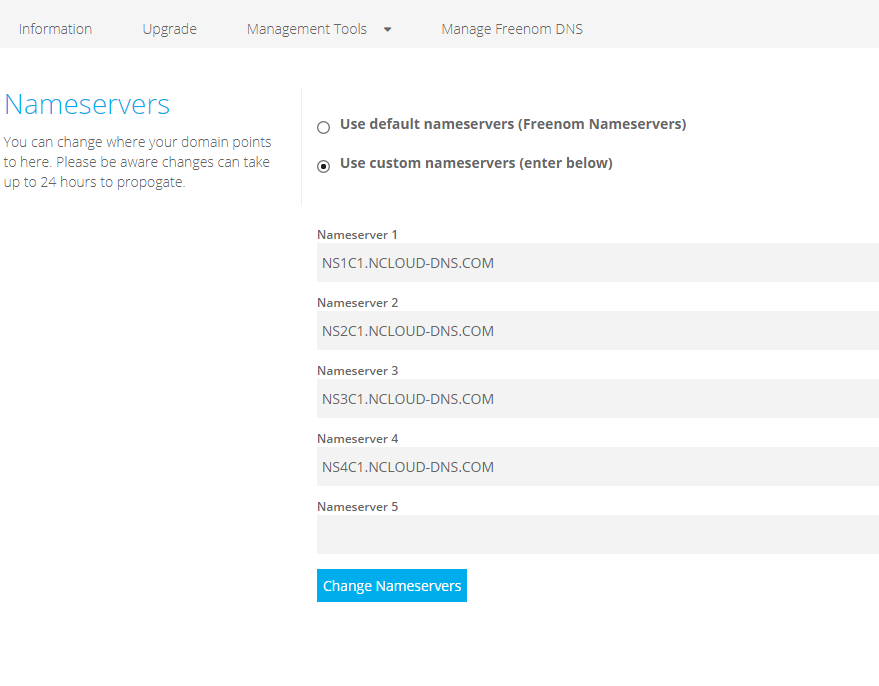 freenom에서 기본적으로 제공하는 dns서버를 사용할지, 혹은 개인이 소유하는 dns 서버를 사용할지 설정이 가능하다.