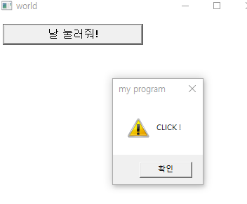 MessageBox(hWnd, TEXT("CLICK !"), TEXT("my program"), MB_OK | MB_ICONEXCLAMATION);