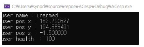 그 다음 메인 프로그램에서 플레이어 구조체를 생성한 다음, 일단은 콘솔에 데이터를 뿌려보는것 부터 테스트 해보면 잘 나오지만, 데이터들이 클래스 생성시에만 들어가고 갱신되지 않는다.