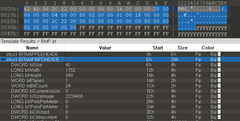 - biSize : 이 구조체의 크기를 담고있음. 현재 구조체 크기가 40인건 이 값을 그대로 따라가기 떄문 . 4byte, 40 → 0x28