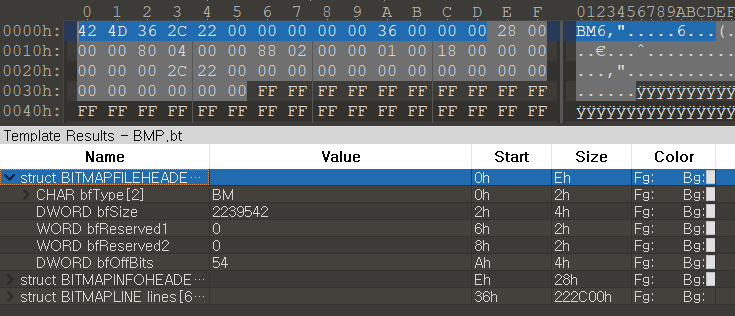 - bfSize : 파일의 크기 : 4byte , 2239542→222c36