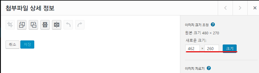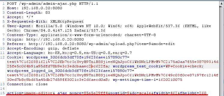 업로드된 이미지 클릭 - 이미지 편집 - 크기 변경 후 "크기" 버튼 클릭 시 admin-ajax.php 에 전달되는 요청에 파라미터를 변조하여 전달