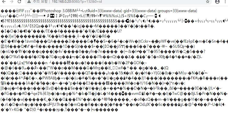 include 된 이미지파일의 php 코드가 동작하고, 게시글에 post 인자로 넘기는 값이 시스템 명령어로 실행되는 것 확인됨.