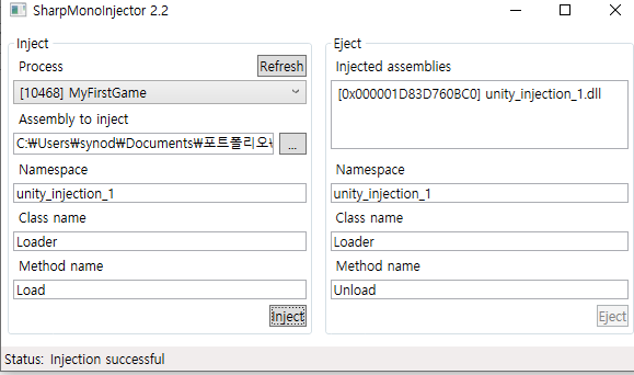 인젝션 도구에서 dll파일 경로와 클래스,메소드 이름을 지정하여 Inject하면 status에 Injection successful (혹은 인젝션된 DLL의 메모리 주소) 이라는 문구가 보이고,