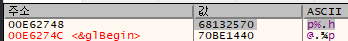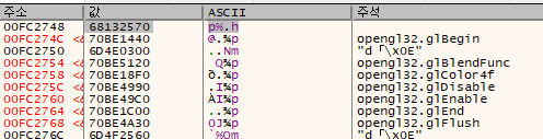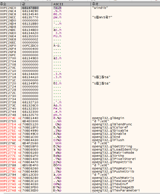해당 주소영역 아래쪽으로 opengl32 함수들의 함수 포인터가 담겨있는게 심볼을 통해 확인된다.
