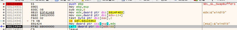 저 함수는 SDL.dll안에 들어있으므로, sdl.dll에서 Swapbuffer를 찾아 디버깅 해보면