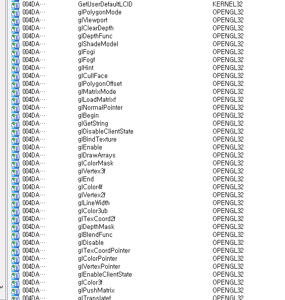 해당 주소영역 아래쪽으로 opengl32 함수들의 함수 포인터가 담겨있는게 심볼을 통해 확인된다.