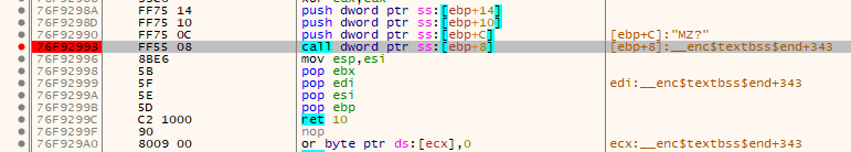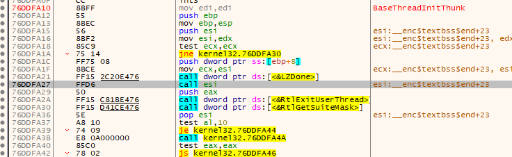 해당 구문이 지나고 나서야 call esi를 통해 프로그램의 entrypoint로 진입하고 main 함수 실행 루틴까지 진행되는걸 볼 수 있다.