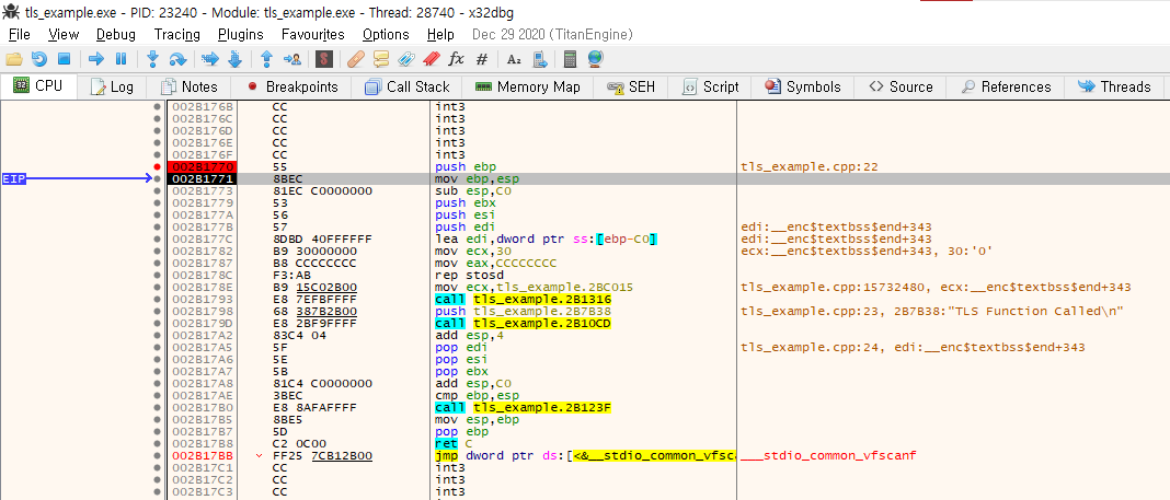 call 어셈이 실행된 다음 tls_callback으로 먼저 점프하는게 보인다.