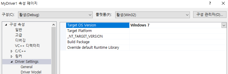 프로젝트 속성 - Driver Settings에 들어가보면 Target OS, 즉 목표로 하는 OS 버전을 선택할 수 있는데, 윈도우의 경우 상위호환성이 지켜지지 않기 때문에 윈7 기준으로 빌드해야 그 하위 OS들에서 실행할 수 있다.