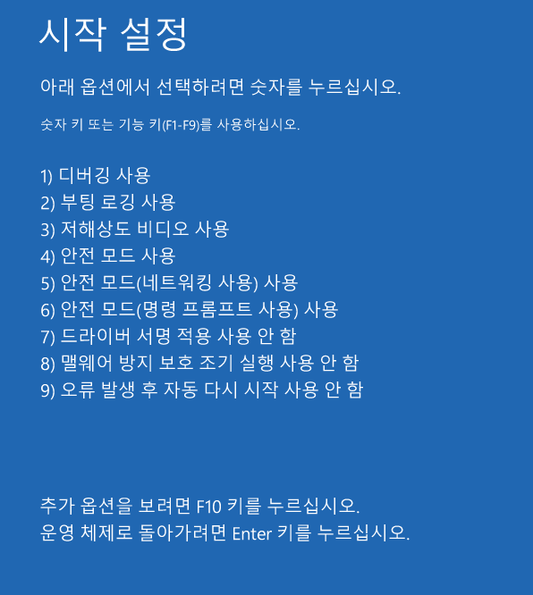 고급 시작옵션 - 문제해결 - 고급옵션 - 시작 설정 선택하여 재부팅하면