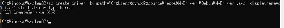 sc create driver1 binpath="C:\Users\synod2\source\repos\MyDriver1\Debug\MyDriver1.sys" displayname=driver1 start=demand type=kernel